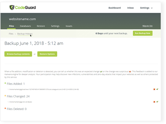 With CodeGuard Website Backup, your website is backed up daily and if disaster strikes, you can restore your site to a previous point in time at the click of a button.