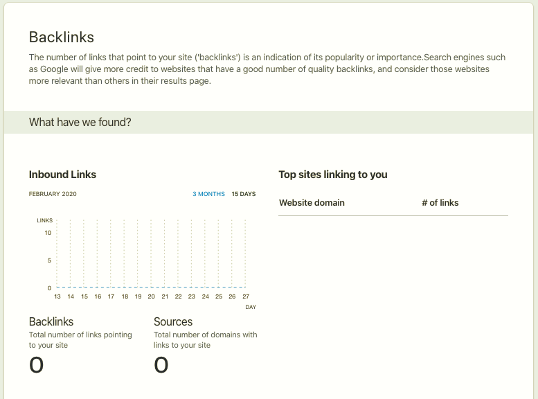 It may happen that you have backlinks pointing to your website and they are not reflected in Marketgoo. We use incoming link information from a third party data provider which follows the standard in SEO metrics. In some cases, the lack of backlinks may also be because even though websites are scanned on a daily basis, we also check certain data on a monthly basis like incoming links, which might not be reflected immediately.